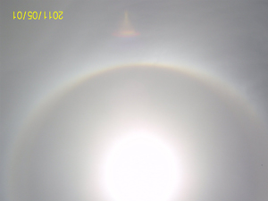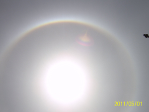 旅行途中,尤為稱奇的是在顯通寺看到了罕見的佛光。當(dāng)時(shí)烈日當(dāng)空,只見太陽周圍出現(xiàn)了一圈大太陽數(shù)倍的光暈,我們禁不住地大聲呼喊起來。當(dāng)我們回顧所拍攝的照片時(shí),清晰可見在佛光中有一尊坐在七彩蓮花座上的金身菩薩,如此奇異的現(xiàn)象,不能不讓人驚嘆。